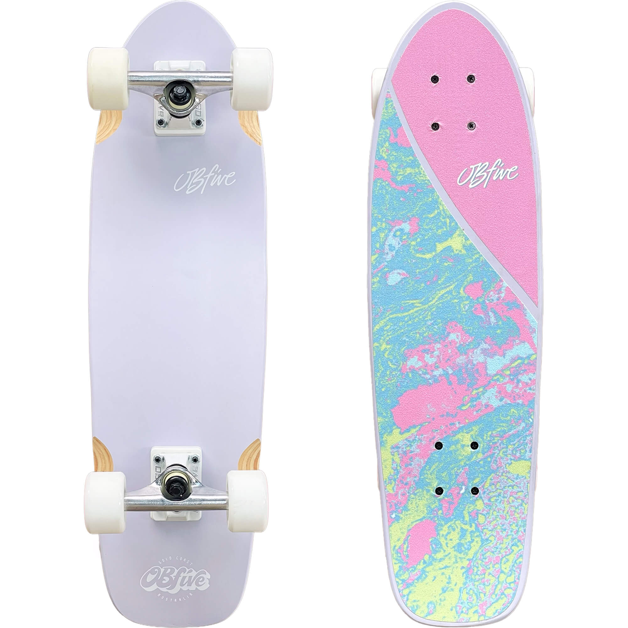 Ride in style with the OBFIVE PASTEL PLASMA LAVENDER 28" Cruiser in a sleek Woodstain finish. Perfect for cruising around town or hitting the skate park.